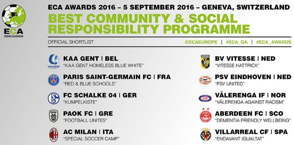 De ECA, organisatie die voetbalclubs in Europa vertegenwoordigt, heeft het Vitesse Hattrick-project genomineerd voor de CSR-award: Best Community & Social Responsibility Programme.