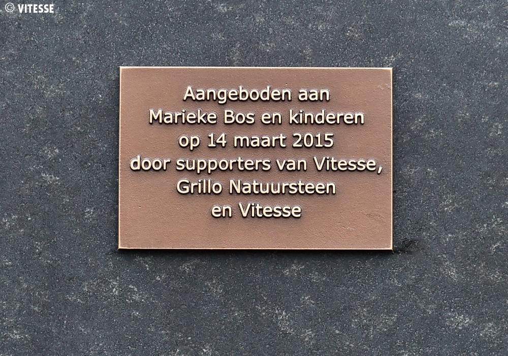 Eén van de initiatiefnemers onthulde de kleine plaquette met de tekst: ‘Aangeboden aan Marieke Bos en kinderen op 14 maart 2015 door supporters van Vitesse, Grillo Natuursteen en Vitesse’.