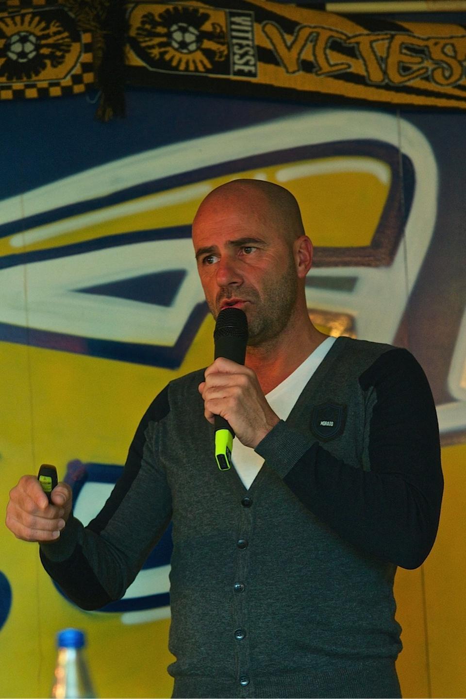 Peter Bosz richtte zich gisteren tijdens het persuurtje tot de bezoekers van de thuiswedstrijden van Vitesse