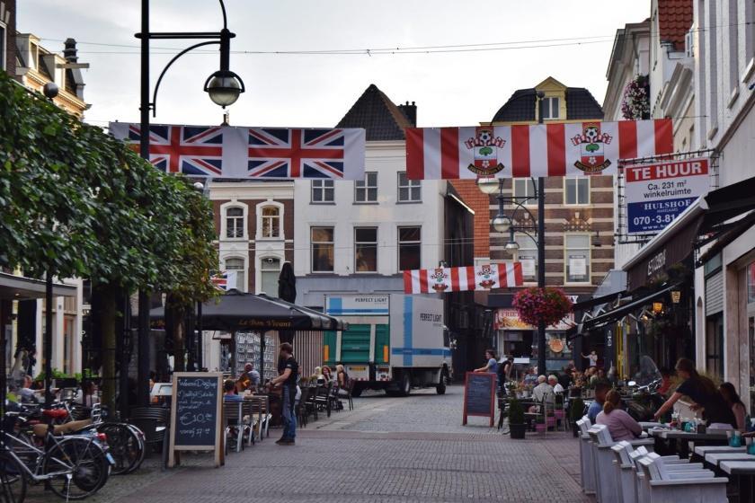 De Jansplaats in Arnhem is voor twee dagen in de Southampton-kleuren rood en wit gehuld.