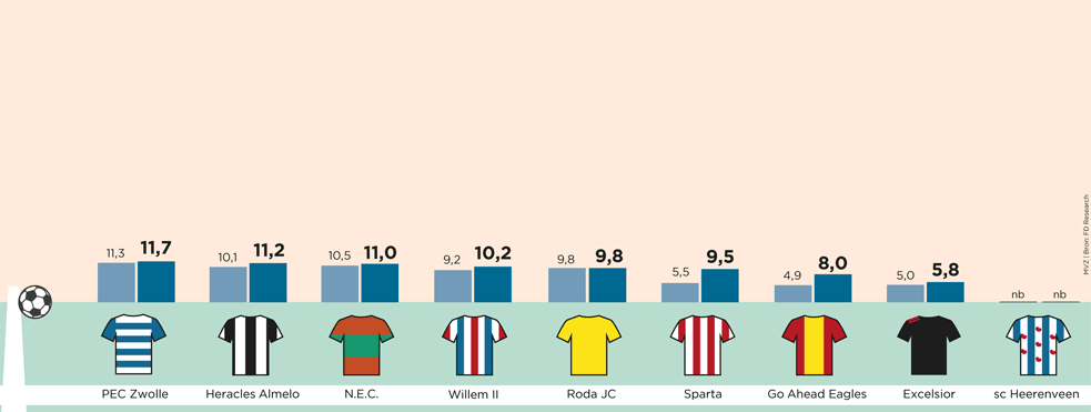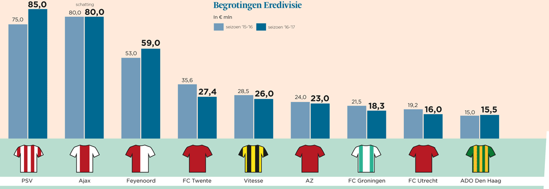 Landskampioen PSV schroefde zijn begroting met € 10 mln op tot € 85 mln. Feyenoord ging van € 53 mln naar € 59 mln. Het beursgenoteerde Ajax geeft zijn begroting niet prijs, maar die bedraagt naar schatting rond de € 80 mln. Op de vierde plaats komt FC Twente met € 27,4 mln.