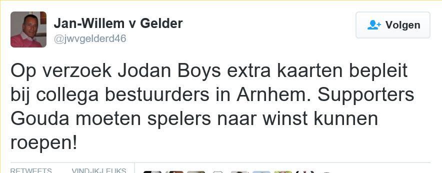 Gezien het enthousiasme en de snelle verkoop en uitverkoop van de kaarten, verwacht Jodan Boys dat er veel meer Goudse supporter naar Arnhem mee willen. In het stadion van Vitesse passen ongeveer 20.000 supporters. Jodan Boys heeft nu een verzoek bij Vitesse neergelegd om meer plaatsen voor de Goudse supporters vrij te geven. De club krijgt daarbij steun vanuit een onverwachte hoek. Jan-Willem van Gelder, de Goudse sportwethouder, zou graag zien dat Jodan Boys meer kaarten krijgt voor het bekerduel bij Vitesse, zo blijkt uit zijn Twitter-bericht. ‘Op verzoek Jodan Boys extra kaarten bepleit bij collega bestuurders in Arnhem. Supporters Gouda moeten spelers naar winst kunnen roepen!’, aldus de wethouder op Twitter.