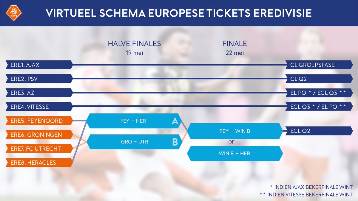 De landskampioen van de Eredivisie kwalificeert zich voor de groepsfase van de Champions League en de nummer twee gaat de tweede voorronde van het miljardenbal in. Voor de overige tickets is de uitkomst van de bekerfinale tussen Ajax en Vitesse van zondag 18 april van belang. De bekerwinnaar heeft recht op een ticket voor de play-offronde van de Europa League. Als de bekerwinnaar al een ticket heeft voor de Champions League, gaat het ‘bekerticket’ naar de nummer drie van de Eredivisie. Het ticket voor de derde voorronde van de Europa Conference League gaat dan naar plek vier.