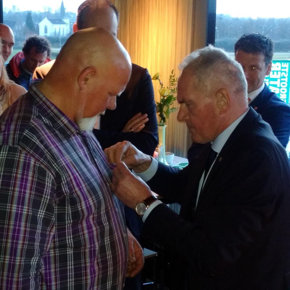 Vervolgens speldde bestuurslid Jan Snellenburg de politieman de speld op. Die toonde zich zichtbaar geroerd door de onderscheiding.