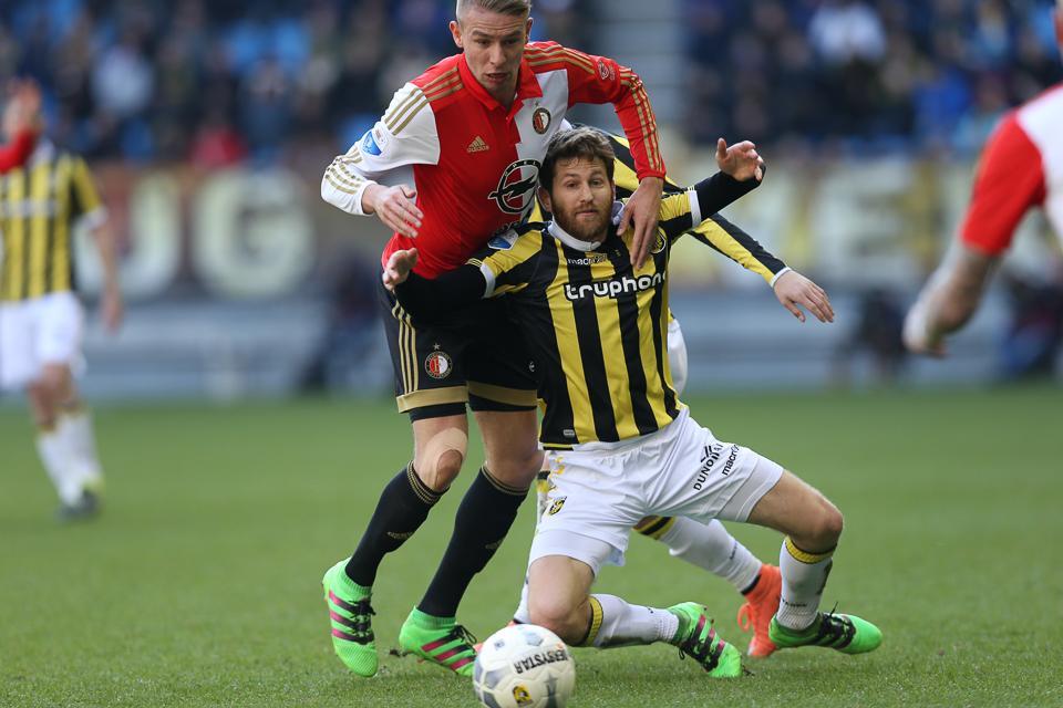 Milot Rashica (links) wordt gestuit door Feyenoorder Jens Toornstra.Nee, ook Vitesse speelde lang niet het voetbal waartoe de Arnhemmers eerder dit seizoen hebben laten zien in staat te zijn. Een late overwinning bij Roda JC Kerkrade (1-2) verlichtte vorige week wel de druk op Rob Maas en de trainer stuurde tegen Feyenoord ook een elftal het veld in zoals de supporters dat graag zien. Enkel de populaire Kevin Diks ontbrak in vergelijking met het door de fans samengestelde team. Arnold Kruiswijk verving hem in de achterste linie.