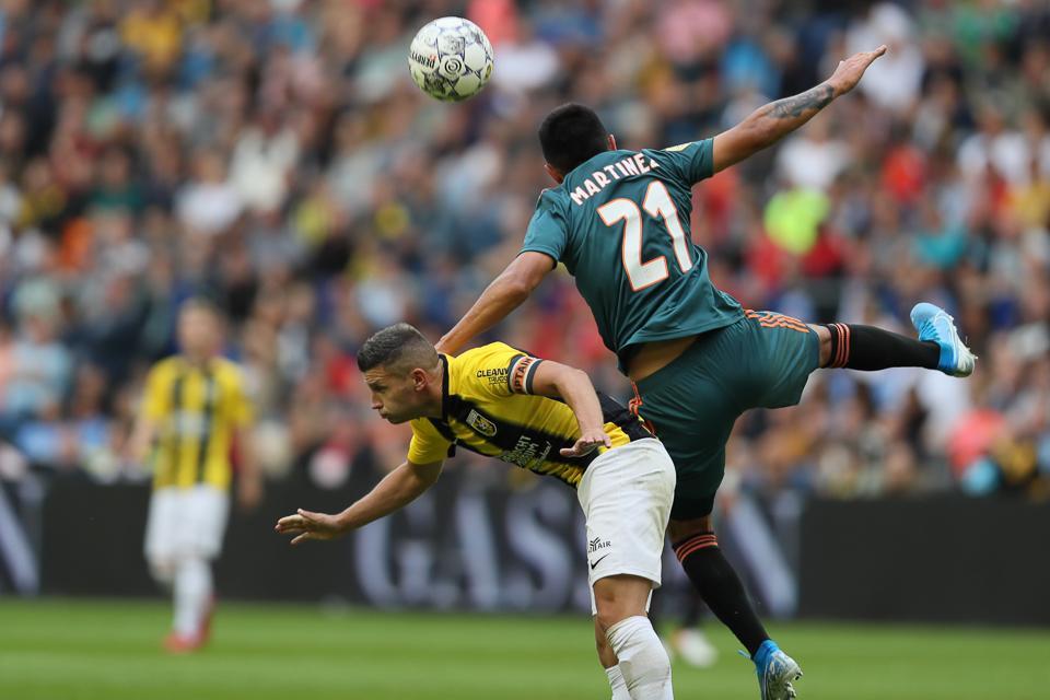 De scheidsrechter en de aanvaller van Vitesse blikken terug op een moment uit het duel met Ajax van zaterdagavond, waarbij Linssen werd geraakt in het zestienmetergebied.