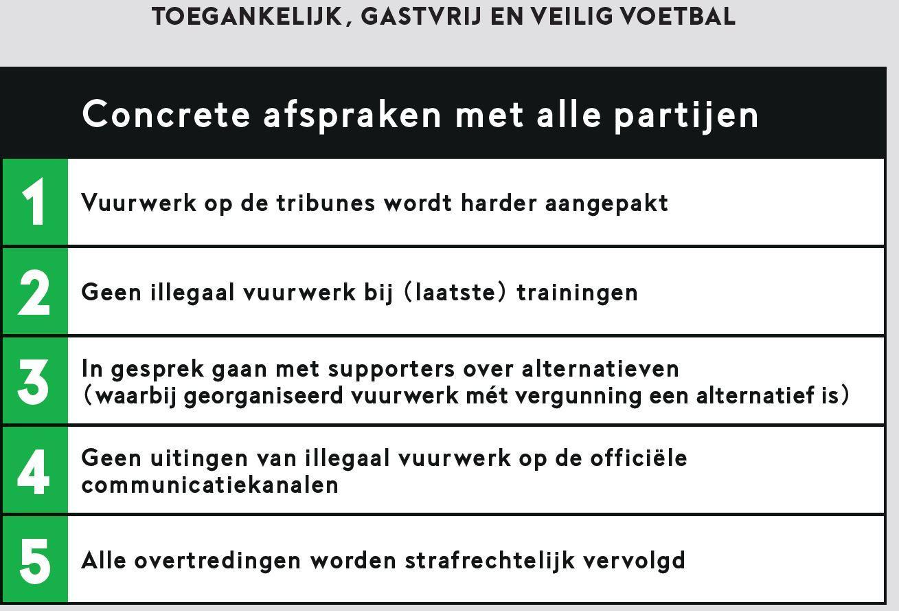 Daarnaast is de club aansprakelijk in het geval van letsel bij supporters en ook kan het de club forse boetes opleveren. Alle bovenstaande partijen, vertegenwoordigd in de zogenoemde ‘Regiegroep Voetbal en Veiligheid’, hebben per direct de volgende afspraken gemaakt om harder op te treden tegen illegaal vuurwerk rondom het voetbal: