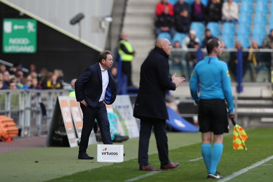 Vitesse-trainer Leonid Slutskiy grapt nog even voorafgaand aan het duel met PSV. ‘Deze uitwedstrijd is een makkie natuurlijk’.