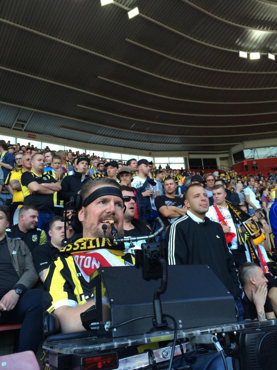 Als roller zit je gewoon tussen de eigen aanhang in een regulier uitvak! Wat een verschil, wat een belevenis! Waar je bijvoorbeeld bij Feyenoord niet durft te juichen voor Vitesse omdat je anders een glas bier in je nek krijgt, kon ik nu in clubkleuren tussen de eigen fans zitten.