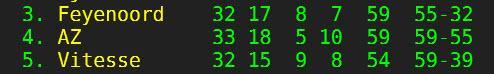 Ook de strijd om plaats 6 en 7 op de ranglijst is nog open. PEC Zwolle en sc Heerenveen staan beiden op 50 punten. De teams kunnen Vitesse niet meer achterhalen.