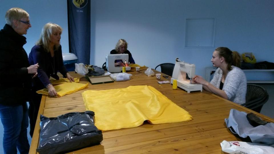 Jong en oud slaan de handen in elkaar om vlaggestokken te maken, stof als basis voor vlaggen om te zomen en ontwerpen voor het derbydoek te projecteren en te omlijnen op stof.