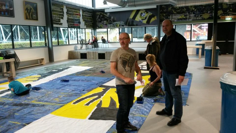 Op diverse plekker wordt er geschilderd aan een immens doek dat, voorafgaand aan de Gelderse derby, de Theo Bos-tribune zal sieren.