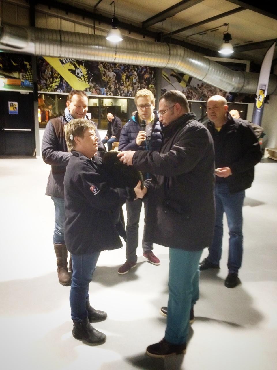 Op de foto en video ontvangt de supportershome verantwoordelijke Maureen Kraaij-Beijer de plaquette nummer 4 uit handen van kunstenaar Peter Holtus.