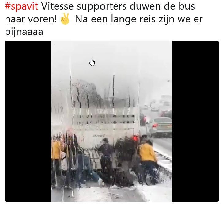 Chaos op de snelweg @KNVB om @SpartaRotterdam @MijnVitesse supporters in het stadion te krijgen. Bussen, auto's glijden weg. Bedenk toch eens in wat voor gevaren jullie al deze trouwe supporters zetten! Supporters duwen de bus van de gestrande plek…. pfff pic.twitter.com/VkpPq3MqC0