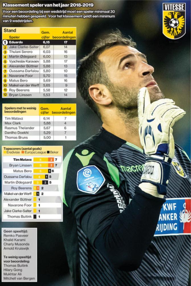 Eduardo (36) komt op grond van de wekelijkse beoordelingen in de Gelderlander in het tussenklassement voor de Speler van het Jaar het beste uit de bus bij Vitesse. De club is met de Portugees al in onderhandeling over een nieuw, eenjarig contract. De keeper, dit seizoen gehuurd van Chelsea, staat open voor een langer verblijf in Arnhem. Maar bovenal streeft hij een beter 2019 na. Meer amusement en aansprekende prestaties.