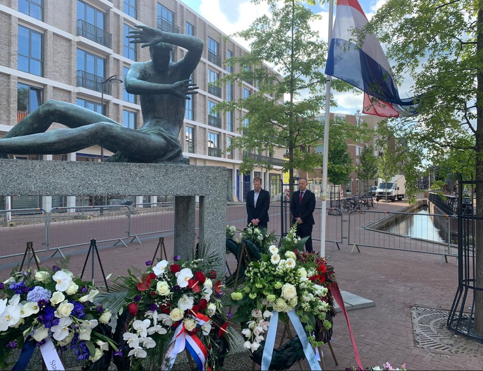 Algemeen directeur Pascal van Wijk van Vitesse en voorzitter Roderik van Veelen van de Supportersvereniging Vitesse legden maandag samen een krans bij het monument ‘Mens tegen Macht’ op het Audrey Hepburnplein