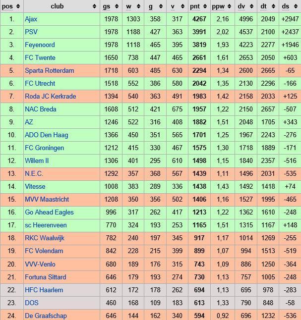 De Vitessenaren hebben overigens een aanzienlijk minder aantal wedstrijden nodig om tot onderstaande puntenaantal te komen, 1008 tegen 1292 duels. Het gemiddeld aantal punten per wedstrijd van Vitesse ligt dan ook op 1,43 tegen 1,11 (bron Wikipedia)