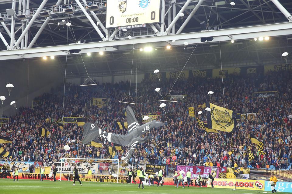 Al na zes minuten lag de bal in het netje. Guram Kashia maakte de 1-0 voor Vitesse en bracht vervolgens een mooi saluut aan de Airborne-veteranen op de tribune.