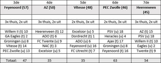 Van de kanshebbers op Europees voetbal spelen Vitesse en AZ nog twee keer thuis van de resterende vijf nog te spelen wedstrijden. De overige clubs spelen nog drie wedstrijden in eigen stadion.