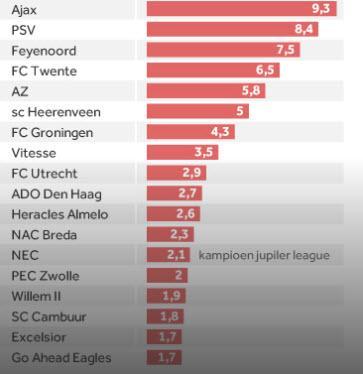 Opvallend is verder dat NEC, de kampioen van de eerste divisie, meteen op plek 13 binnenkomt op de lijst van de tv-gelden. Dat komt doordat de Nijmegenaren jarenlang in de eredivisie hebben gespeeld en slechts één jaar weg zijn geweest.
