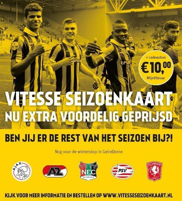 Volgende week speelt Vitesse tegen Ajax. In GelreDome begint de wedstrijd op zondag 25 oktober om 14.30 uur. Voor deze wedstrijd geldt géén vrije verkoop. Wil je dit seizoen geen thuiswedstrijd meer missen? Bestel dan nu de in prijs verlaagde seizoenkaart via www.vitesseseizoenkaart.nl.
