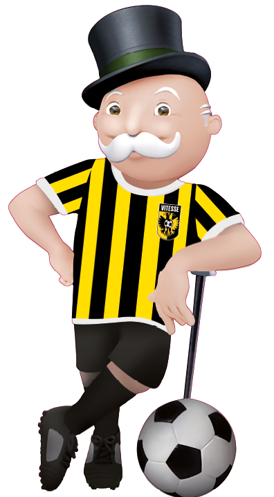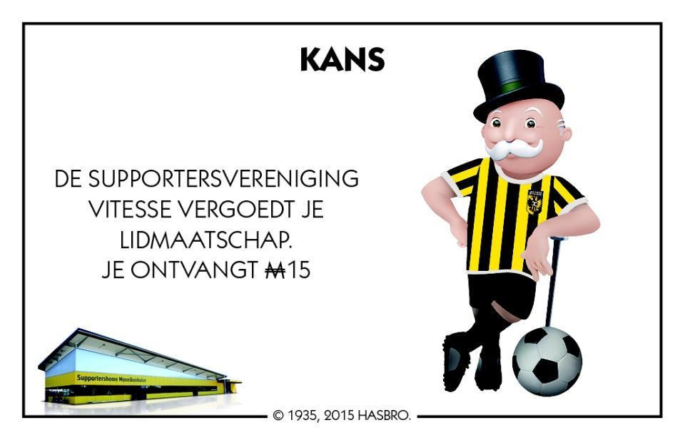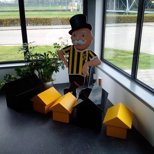 Een voorbeeld van de omdoos, de gele Monopoly-huisjes en zwarte hotels kun je, samen met het befaamde Monopoly-mannetje in een Vitesse-shirt, op het podium van het Supportershome Monnikenhuize vinden.
